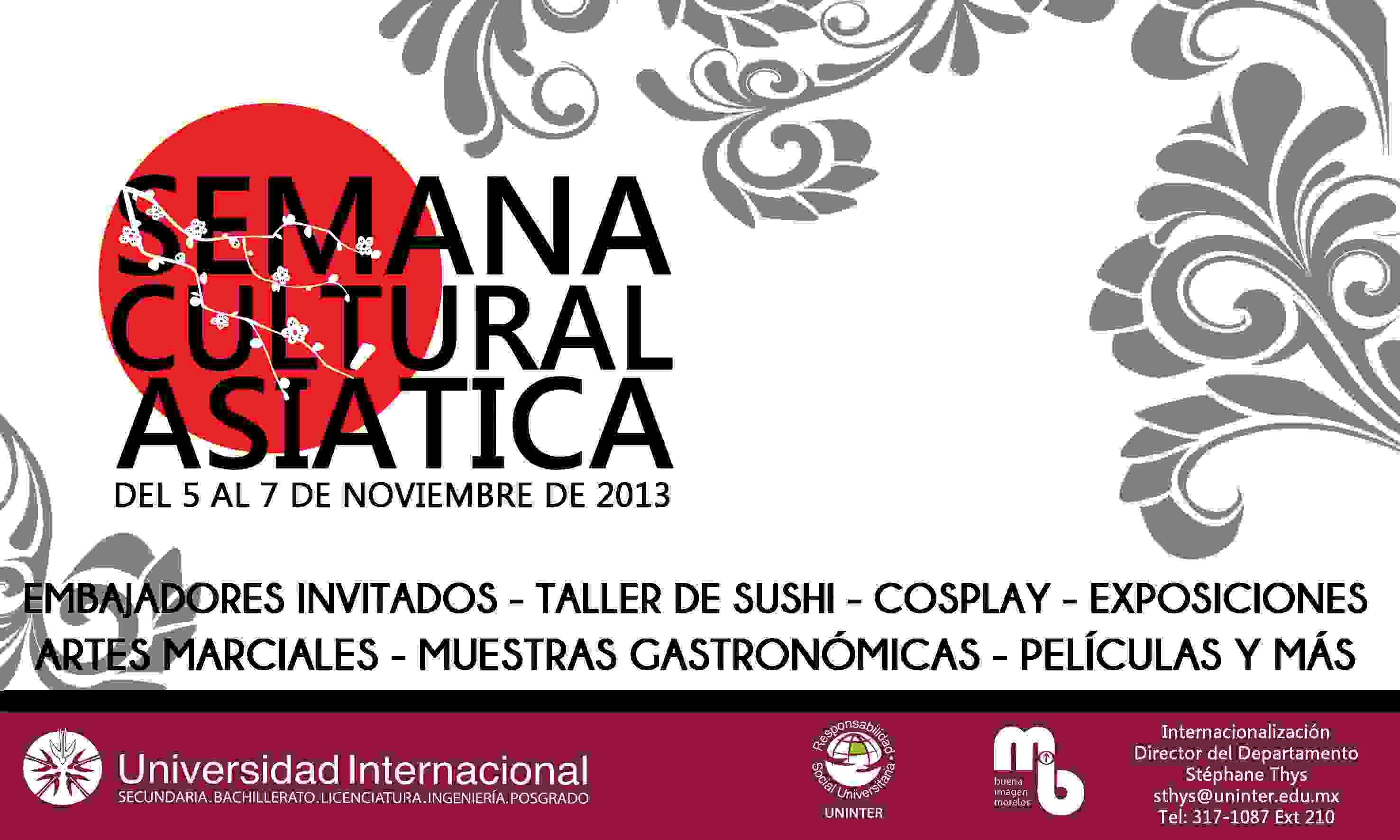 Los próximos 5, 6 y 7 de noviembre los estudiantes de la Universidad Internacional podrán disfrutar de diversas actividades relacionadas a la cultura asiática con el fin de aprender de una manera más práctica a cerca de este continente. Los alumnos de esta institución podrán participar en talleres, conferencias, concursos así como disfrutar de diversas exposiciones. Todo esto impartido por personalidades destacadas como el Excmo. Embajador de la República de Corea quien impartirá una conferencia magistral sobre la relación bilateral entre México y Corea del Sur así como también brindará una exposición cultural de su país.
