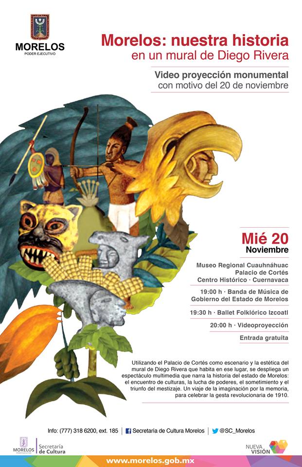 Con motivo de la celebración del Aniversario de la Revolución Mexicana, este 20 de Noviembre del 2013, se proyectará en el Palacio de Cortés en el espacio donde se encuentra el mural del pintor Diego Rivera, un espectáculo donde se proyecte la historia de nuestro bello Estado de Morelos, la mezcla de culturas, la lucha de poderes, el sometimiento y el triunfo de los mestizos.