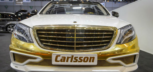 El fabricante alemán de coches Carlsson presentó en el Salón del Automóvil de Ginebra el primer vehículo del mundo cubierto de oro. Se necesitaron unas mil láminas de oro para recubrir la mitad de la carrocería del modelo presentado en la ciudad suiza, un Mercedes S500 de nueva generación, y que forma parte de una exclusiva edición especial de sólo 25 ejemplares.