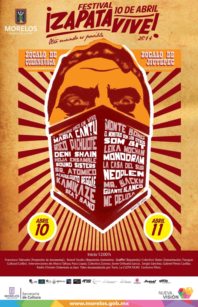 Distintos eventos culturales se llevan al cabo en el estado de Morelos y CONACULTA como encargada de estos fomenta e invita a sus habitantes y visitantes a disfrutar de eventos como el Festival “¡Zapata vive 2014!” que tendrá lugar en Plaza de Armas, en Cuernavaca; Con el motivo de conmemorar el aniversario luctuoso del general Emiliano Zapata; tendrán presencia distintas agrupaciones con quienes se podrá disfrutar de una gran diversidad de propuestas sonoras. También se contará con proyección de documentales, exposición de graffitti, demostración de skate y tianguis cultural