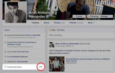 El botón se llamará Ask (Preguntar) al lado de Relationship Status (Situación sentimental) y está comenzando en algunos perfiles.
