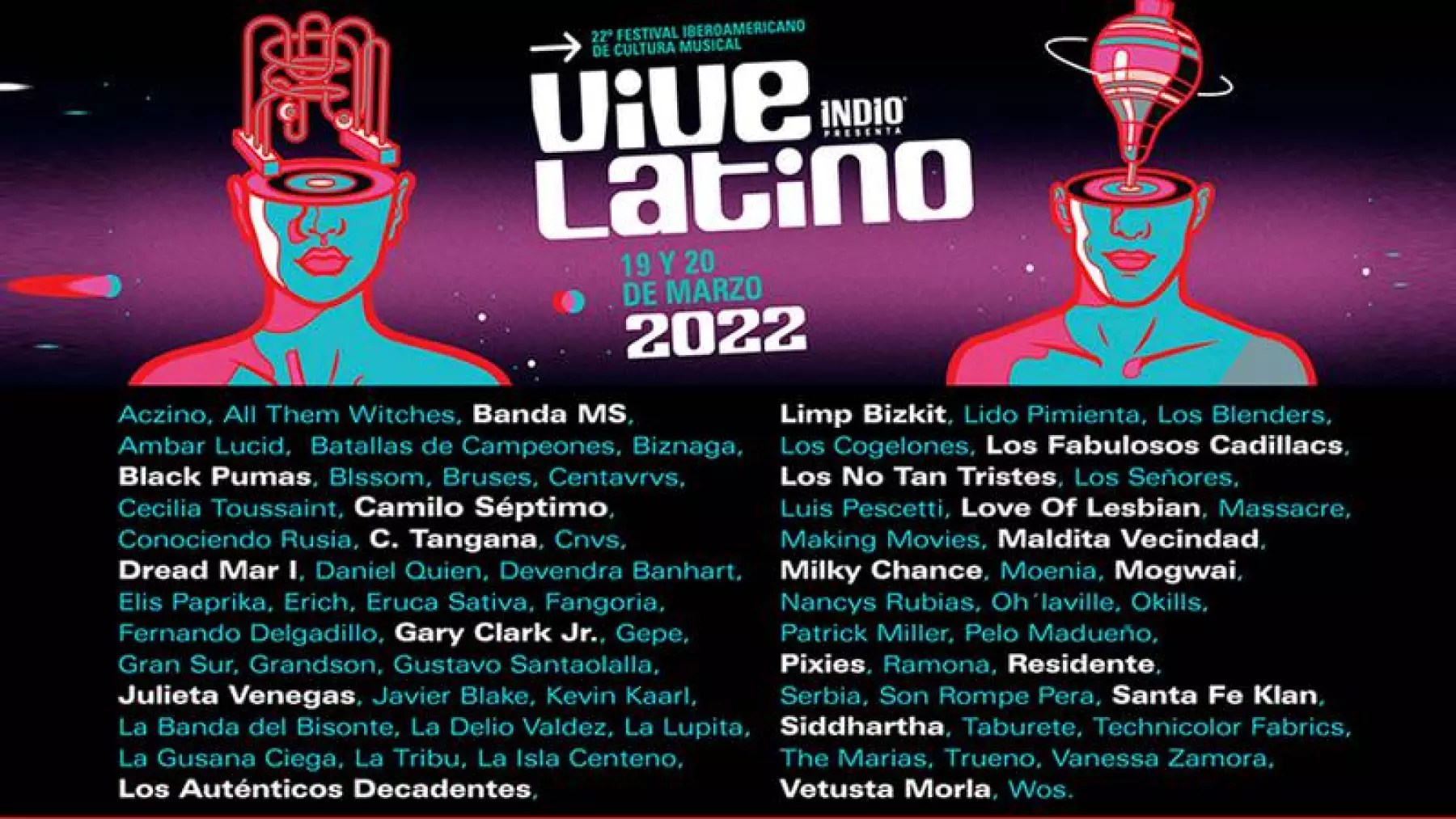 Ambar Lucid, Banda MS, Batallas de Campeones, Biznaga, Black Pumas, Blssom, Bruses, C. Tangana, Camilo Séptimo, Cecilia Toussaint, Centavrvs, CNVS, Conociendo Rusia, Daniel Quien, Devendra Banhart, Dread Mar I, Elis Paprika, Erich, Eruca Sativa, Fangoria, Fernando Delgadillo, Gary Clark Jr,. Gepe, Gran Sur, Grandson, Gustavo Santaolalla, Javier Blake, Julieta Venegas, Kevin Kaarl, La Banda del Bisonte, La Delio Valdez, La Gusana Ciega, La Isla Centeno, La Lupita, La Tribu, Lido Pimienta, Limp Bizkit, Los Auténticos Decadentes, Los Blenders, Los Cogelones, Los Fabulosos Cadillacs, Los No Tan Tristes, Los Señores Blues Band, Love Of Lesbian, Luis Pescetti, Making Movies, Maldita Vecindad, Massacre, Milky Chance, Moenia, Mogwai, Nancys Rubias, Oh’Laville, Okills, Patrick Miller, Pelo Madueño, Pixies, Ramona, Residente, Santa Fe Klan, Serbia, Siddhartha, Son Rompe Pera, Taburete, Technicolor Fabrics, The Marías, Trueno, Vanessa Zamora, Vetusta Morla y Wos.