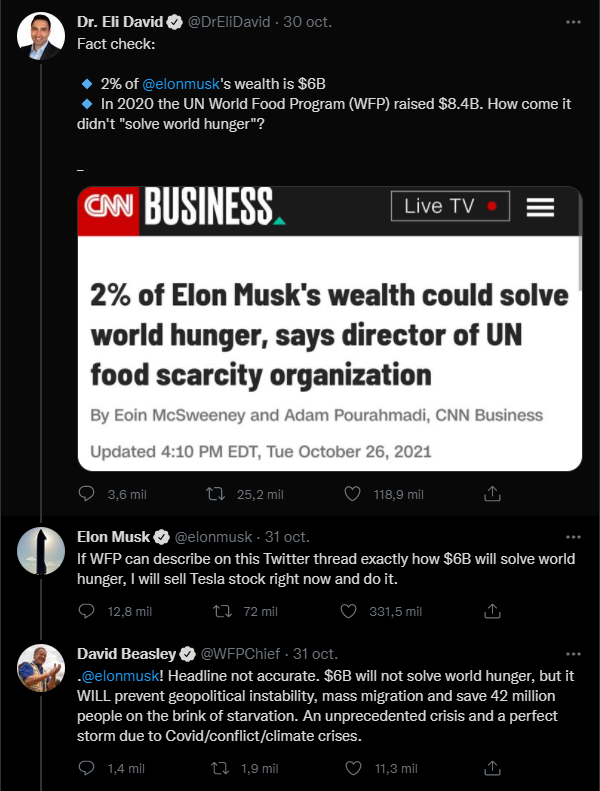 Sus comentarios del empresario se produjeron después de que el director del Programa Mundial de Alimentos (PMA) de las Naciones Unidas, David Beasley (David Beasley), se dirigiera especialmente a las dos personas más ricas del mundo, Jeff Bezos y Musk, a quienes desafiaron » a dar un paso adelante ahora, de una sola vez» para ayudar a resolver el hambre en el mundo en una entrevista con CNN la semana pasada.