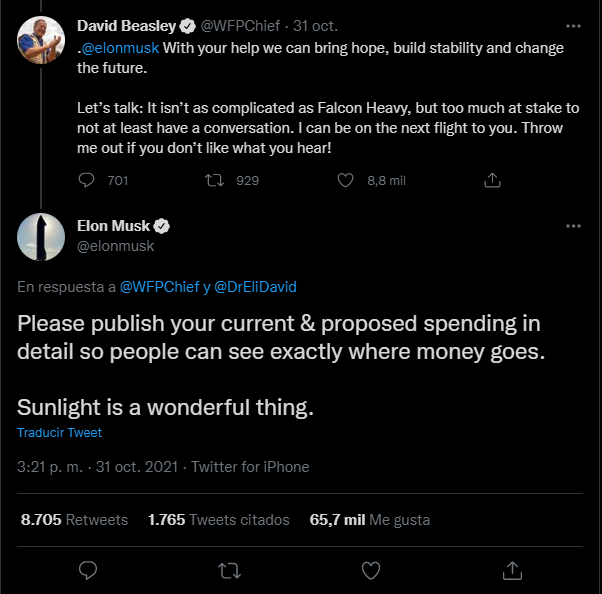 Beasley respondió a la publicación de Musk en Twitter, diciendo que puede asegurarle al multimillonario que el Programa Mundial de Alimentos ha establecido un sistema de contabilidad de transparencia y código abierto. «Su equipo puede revisar y trabajar con nosotros para estar totalmente seguros de ello», dijo.