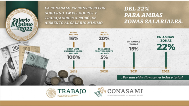 El 1 de diciembre fue anunciado por la Comisión Nacional de Salarios Mínimos (CONASAMI), a partir del primer día del 2022 el salario mínimo tendría un aumento del 22 por ciento con respecto a su actual valor.