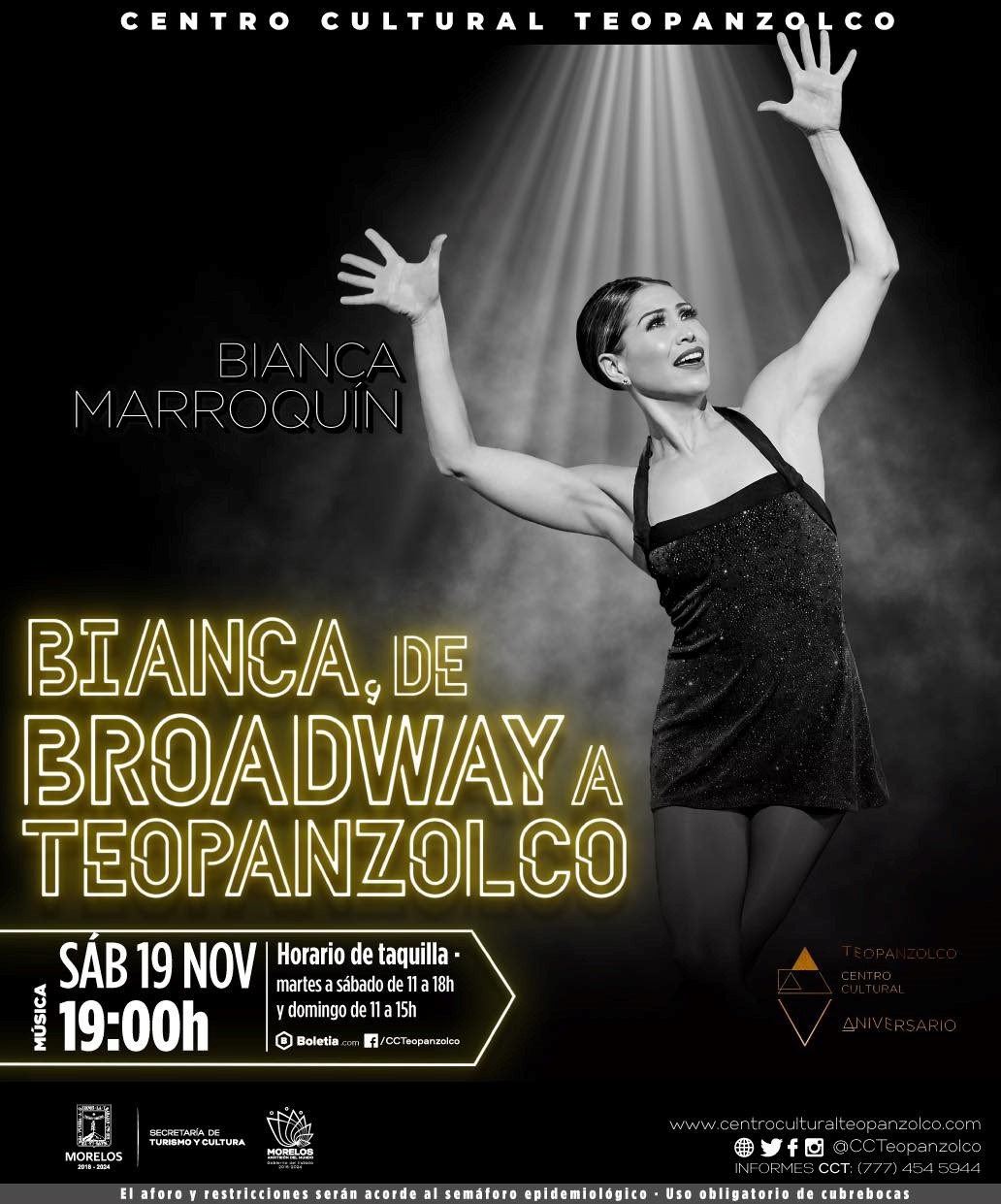 | El día sábado 19 de noviembre a las 19:00 horas el centro cultural de Teopanzolco abren un espacio para la talentosa mexicana, Bianca Marroquín. Inicio su carrera en la Ciudad de México en la obras de La Bella y la Bestia de Walt Disney, Rent, Fantasma de la Ópera, Monólogos de la Vagina y Chicago. Bianca es la primera mujer mexicana en ser invitada a cruzar de México a Broadway en un papel protagónico en el 2002, por lo que recibió el premio Helen Hayes Award. Reconocida también como bailarina de ballet, cantante y actriz mexicana de teatro y televisión. Trabajó en las peliculas Half Brothers, Gods eye y Elenor. Al igual que en series como Esperanza del corazón, Pequeños gigantes, Mira quién baila, Fosse/Verdon y Habla loud. Y es una de las pocas actrices que interpreta a dos protagonistas femeninas. Bianca Marroquin dará sus mejores actuaciones para delante de un publico mexicano dentro del Centro Cultural de Teopanzolco. “¡WOW! de verdad que no se la pueden perder un talento sin igual tuve la oportunidad de verla en Broadway y no podía dejar de verla! Espectacular” —- Review en Facebook. SITIO WEB: https://biancade-broadway-a-teopanzolco.boletia.com/?fbclid=IwAR0eLGRUfCT0hXFjANfddlWrEAJdspx4lH0qQDIVZQuwnMy3OE9sLOIVG_I Centro Cultural Teopanzolco Río Balsas 22 Col. Vista Hermosa, C.P. 62290, Cuernavaca, Morelos Precios ORO $1350.00 MXN Palcos $1200.00 MXN PLATINO $1250.00 MXN VIP $1500.00 MXN |