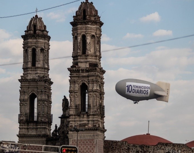 La escritora Brenda Lozano y varias feministas como Johana Murillo, mediante sus cuentas de Twitter, el pasado lunes 7 de marzo del presente año, publicaron una imagen de un Zepelín junto con un texto donde decían «Nos ponen muros, vallas y granaderos. Nos dicen que no se pueden hacer pintas, que no se pueden romper ni quemar cosas: entonces subimos porque en el cielo no hay límites».