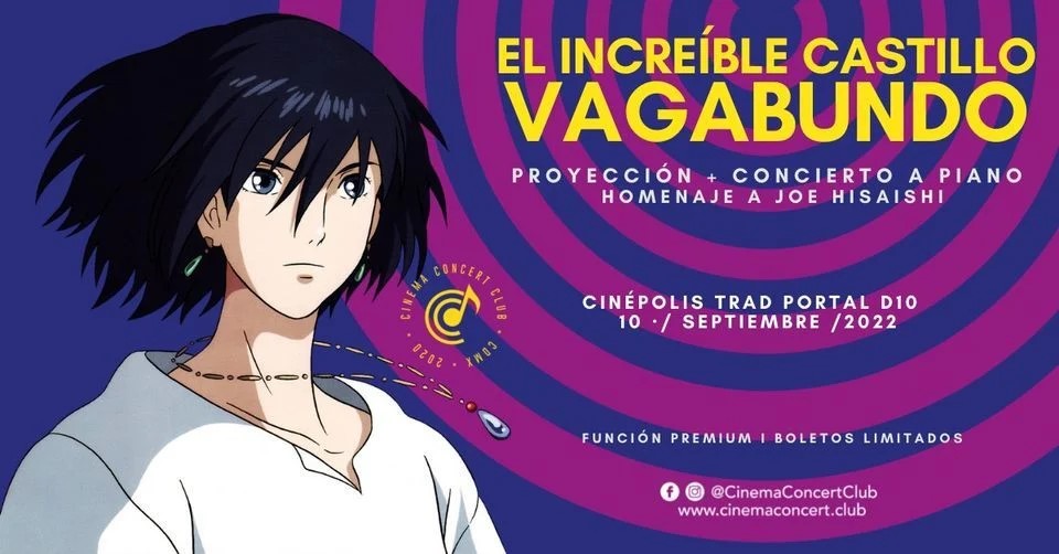En este momento la película ocupa el puesto #164 de los 250 con una calificación de 8.1. El Increíble Castillo Vagabundo es una de muchas obras maestras de la mente de Miyazaki Hayao. La película fue producida por el Studio Ghibil, estudio reconocida por sus películas ganadoras en la categoría de animación. La película está ambientada en un reino ficticio en el cual tanto la magia como la tecnología del siglo XX están presentes. El concierto es una ocasión especial dado únicamente por cinepolis y es para celebrar las mejores películas que tenemos hoy en día. Próximamente cines dentro de México harán proyecciones iguales de la función. Antes de iniciar la proyección de la película, harán un homenaje a piano hacia Joe Hisaishi, compositor famoso por su asociación musical dentro de las películas producidas por el Studio Ghibli Flim Studio. La función contará con piezas de arte creadas por el artista ArteBrioMex, piezas únicas y exclusivas del tour prémium de Cinema Concert Club.