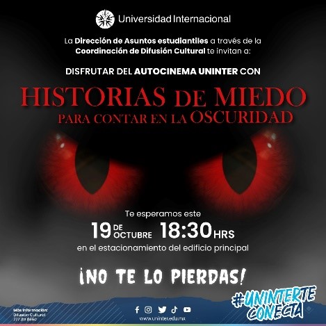 UNINTER abre sus puertas para que este 19 de octubre en punto de las 6:30pm en el estacionamiento del principal, sean participes del evento organizado por la Dirección de asuntos estudiantiles, a través de la coordinación de Difusión Cultural; en el cual se hará la proyección de una película del género de Terror, haciendo alusión al mes de octubre, con las festividades de Halloween.